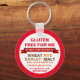Um guia personalizado de comida sem glúten em um chaveiro pessoal que inclui um local para um número de contato de emergência para perguntas.