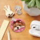 Adorável cachorrinho inglês com óculos escuros, em fundo listrado rosa, pintado pela artista Maryline Cazenave.