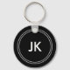 Chaveiros monogramas em preto e branco desenhados com iniciais de nome de monograma e círculos geométricos que podem ser personalizados diretamente no nosso website. Criado como um favor partidário para casamentos, partidos ou eventos sociais e é um design preparado para orçamento que você pode usar para comprar em massa.