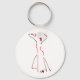 This dance themed keychain shows a brush painted sketch of a flamenco dancer in a red dress. She stands in a classic flamenco pose with a fan held above her head and has a rose in her hair.