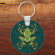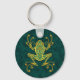 Este sapo tribal é decorado com intrincados ouros amarelos e padrões ponto. O interior do sapo é pintado de uma cor azul profunda que é ecoada no fundo, dando ao padrão um belo contraste. Uma sombra cai logo abaixo do fazer simétrico do sapo da árvore que parece flutuar logo acima da superfície deste chaveiro. Esta design estilizada é uma representação impressionante desta maravilhosa pequena criatura.