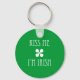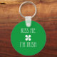Chaveiro verde que diz "BEIJA-ME EU SOU IRLANDÊS" em branco com trevo branco.