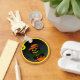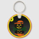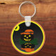 Esta é uma imagem de um Jack O Lanterna toda vestida. Uma abóbora preta com bruxas laranja que está sentada sobre uma cama de folhas verdes. O Jack o Lanterna está iluminado com olhos brilhantes e um sorriso. Um fundo preto foi adicionado para que você possa ver o reflexo dele. Os chaveiros estão disponíveis em estilos e tamanhos variados.