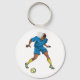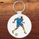 Um jogador de futebol de azul chutando uma bola. Esta design parece realmente eficaz nestes Chaveiro