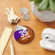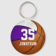 Este chaveiro de basquete para rapazes apresenta um gráfico de basquete simples com as suas cores púrpura e branca em dois dos painéis do basquete e o nome de jogador facilmente personalizável e o grande número de jersey numa letra estilo desportivo, estilo varsity - por katz_d_zynes