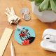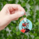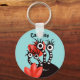 Monstro bonito personalizou o chaveiro com uma criatura de desenho animado preto com quatro olhos em longos caules riscados, pretos e brancos, sorrindo, escondidos em tulipas abstrato vermelho. Este design de menina giro tem texto personalizável.