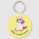 Keychain with cute unicorn and text "I believe in smart unicorns". The unicorn has hair in pink and purple colors and wears pink glasses. The design is customizable.