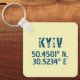 Chaveiro design com coordenadas de latitude e longitude para Kiev, Ucrânia com uma fonte azul escura e angustiada.