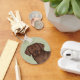 O desenho original de Destei de um cão de raça Labrador Retriever, de cor castanha chocolate, que se aproxima da cabeça. A cor de fundo é verde com textura decorativa. A cor de fundo pode ser alterada para qualquer outra cor e a textura pode ser removida, se desejado.