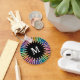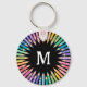 Chaveiro redonda colorida para uma sala de aula personalizada com a inicial do professor rodeada de lápis coloridos em cores suaves do arco-íris. Chaveiro de monogramas coloridos para o seu estúdio de arte personalizado com um inicial em branco contra um fundo preto com muitos lápis coloridos todos apontando para o centro e cores esportivas do arco-íris.