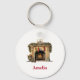 Chaveiro com uma ilustração calorosa e acolhedora com uma lareira antiquada. Parar com cuidado. Garland pendurada sobre a manta. Um fogo quente a ruir no coração.