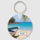 Um chaveiro personalizado com uma cena de praia tropical idílica. Água clara de cristal azul turquesa e uma praia arenosa castanha macia. Algumas folhas de palma penduradas de cima. Um velho barco a remo de madeira fica sentado na praia. Uma paisagem serena e pacífica.