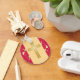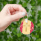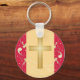 Este favor de chaveiro de casamento é decorado com bares de ouro, cruz cristã, vermelho e ouro damasco, num fundo de damasco dourado.
