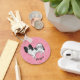 A ilustração original do desenho animado de Destei de um cão da raça Papillon, preto e branco, de cor casaco, numa cor de fundo rosa, com um padrão de corações em diferentes tamanhos. Há também uma área de texto personalizável para um nome.