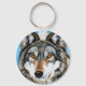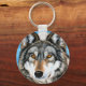 Uma pintura acrílica de um lobo cinza sobre um fundo azul.