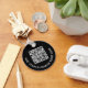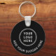 Chaveiro preto de promocional moderno para sua empresa ou organização. Carregue seu logotipo, crie facilmente um código de QR digitalizável vinculado ao seu site e adicione duas linhas de texto branco, como seu nome comercial, slogan, obrigado ou deixe o vazio.