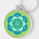 Chaveiro de design de mandala japonesa que retrata uma flor estilizada de lótus, simbolizando a pureza, despertar espiritual e fidelidade - flor em azul-céu mole, aqua leve e verde-jade sobre um fundo verde limão