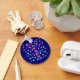 Um Símbolo em tons de lilás, violeta, roxo e magenta forma familiar usada para descrever Deusas e Bruxas com estrelas azuis e as palavras "Mágica Acontece".