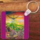 Pintura acrílica colorida e vibrante em verde, amarelo alaranjado, roxo, castanho vermelho, cores brancas de 2009, Duelo entre Bradamant e Negromcer em seu grifão com asas enormes. Orlando Furioso, Canto 2 escrito pelo poeta Renascentista italiano Ludovico Ariosto 1516 .