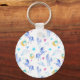 Um chaveiro com um padrão de aquarela unicórnios criando nuvens murchas, nuvens, estrelas e corações. Design Whimsical.