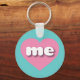 Este chaveiro apresenta um coração cor-de-rosa vibrante contendo as letras maiúsculas, brancas e em negrito, arredondadas, uma abreviação lúdica para o estado do Maine, o estado do pinheiro.
