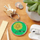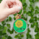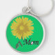 Esta imagem é de uma margarida amarela em um caule com uma folha verde. A palavra "Mãe" é impressa perto do fundo do design. Um plano de fundo verde foi adicionado a este design. Disponível em vários estilos e tamanhos desses chaveiros.