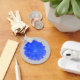 Esta bonito chaveiro apresenta uma fotografia de uma flor de marigold que foi manipulada para torná-la uma espantosa cor azul brilhante. A flor se senta sobre uma cinza.