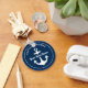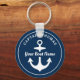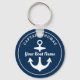 Design de chaveiro náutico redondo apresenta um design simples, azul marinho e branco, estilo costeiro, com sotaque de âncora de barco. Personalize o texto personalizado com o nome do proprietário/capitão do navio e do navio, o local ou outro texto preferido.