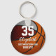 Este chaveiro personalizado de basquete para meninas ou rapazes apresenta a imagem realista de uma bola de basquete que tem dois painéis recoloridos - um marrom e uma cinza - facilmente personalizável com o nome do jogador & número de camisa, além do nome da escola e do nome do mascote - por katz_d_zynes