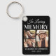Chaveiro de memorial de dupla face com 3 imagens do seu ente querido perdido, o texto "na memória amorosa", o nome, as datas de nascimento/morte.