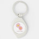 Metal keychain with a floral design featuring pink and yellow flowers and "BETTY GIRL" text. Shown alone and beside a notebook and phone on a table.