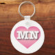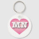 Esta cadeia-chave apresenta um coração cor-de-rosa com um centro lavado em branco sobreposto pelas letras maiúsculas MN, a abreviação oficial para Minnesota, o estado estelar norte.