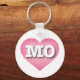 Esta chaveiro apresenta um coração calmo, legal e colecionado cor-de-rosa com um centro branco lavado contendo as letras maiúsculas brancas em negrito MO, a abreviação oficial do estado de Missouri, o estado Show Me.