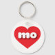 Este chaveiro apresenta um coração vermelho vibrante contendo as letras minúsculas em letras maiúsculas, brancas e arredondadas, uma abreviação lúdica para Missouri, o show me state.