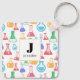 Chaveiro personalizado com um padrão divertido e colorido. Cientista pesquisador vibe com bicos e frascos de diferentes formas e tamanhos em cores brilhantes e felizes.