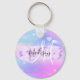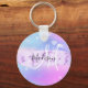 Chaveiro giro e fofo com um cor rosa, roxo, lilás, azul e arco-íris de unicórnio aqua cor rosa, roxo, fundo brilhante. Seu nome personalizado e monograma são escritos em um elegante script com letras de mão com um fundo de pincel púrpura de pincel de pincel de unicórnio púrpura. Um aniversário perfeito ou presente de Natal!
