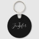 Mantenha-se atualizado com suas chaves usando este chaveiro de Monograma de Script Lettered Preto Elegante. Ele foi projetado com um fundo preto personalizável. O centro tem um nome em um roteiro branco, escrito à mão e monograma em cinzas de luz. Faz uma ideia elegante excelente para ela. Clique na opção personalizar modelo e digite nome e monograma.