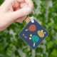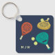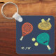 Crie um presente personalizado para seu padel player favorito. Este chaveiro apresenta ilustrações de raquetes de padel e bolas em tons de terra cotta, ouro e chalé contra fundo azul marinho. Está pronto para ser personalizado com iniciais de monograma em creme.