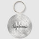 Este chaveiro de chic apresenta um padrão de confete falsa de diamante brilhante em um fundo de película falso prateado. Personalize-o com a sua fonte inicial em branco serif e o seu nome no script de pincel em estilo de escrita manual de cinzas de carvão.