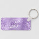 Brilho púrpura claro e elegante com faíscas contra uma imagem gráfica de folha metálica embebida em lavanda falsa. O monograma de caligrafia roxo e rico branco rico no centro pode ser personalizado. Todos os elementos brilhantes e brilhantes neste moderno design feminino são gráficos digitais. Favoritos para festas da corrente de precioso monogramas para sua celebração especial de aniversário. Isto seria um bom tamanho para as chaves de trabalho dela também.