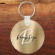 Este elegante chaveiro personalizado apresenta um monograma e primeiro nome em um roteiro preto e branco moderno sobre fundo de metal escovado em ouro.