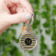 Este chaveiro personalizado apresenta um monograma de ouro personalizável em uma estrutura preta em uma falso brilho dourado, fundo listrado preto e branco.