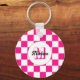 Verificado o chaveiro de Monograma geométrico retrátil branco-rosa-quente. Presente de acessórios para ela. Legal padrão quadrado geométrico verificado por retrô. Verificador moderno cor-de-rosa do azulejo Vintage. Personalize com seu nome e inicial personalizados.