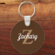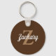 Este chaveiro personalizado apresenta um monograma bronzeado e um nome de script retrô branco em um fundo marrom.