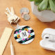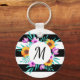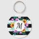 chaveiro de botão bonito com uma camada de aquarela floral sobre fundo listrado preto e branco. Personalize o monograma escolhendo entre muitas fontes maravilhosas.
