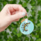 Chaveiro crescente com uma ilustração vetorial sombreada deste corpo celeste amarelo envolto em flores abstrato-líleas sobre fundo azul claro com nuvens brancas pouco visíveis. Este trabalho de arte digital da lua esquisita é desenhado num estilo parecido com tatuagens com contornos negros grossos. Tem uma mistura de sentimentos góticos e boêmicos.