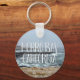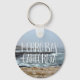A gorgeous overcast day in Morro Bay California brings cool ocean waves to the shore in this coastal photograph gift. This pretty seaside keychain souvenir features white script over the beach rocks and grey sky.