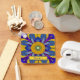 Um design de mosaico amarelo ensolarado e azul com acentos de verde e roxo, e texto personalizável para um nome ou palavra na frente e uma mensagem mais longa no verso. Este padrão bonito combina o estilo do mosaico eterno da era romana com uma paleta provencal.