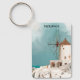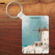 Chaveiro impressionante e belo mostrando a arquitetura única e as moinhos de vento na ilha grega Mykonos, que faz parte da ilha das Cíclades. Faz um excelente de lembrança e de presente para todos os turistas e visitantes do famoso destino da viagem europeia.