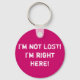 Chaveiro de mulheres que diz "Eu não estou perdido! Estou aqui!" Fundo rosa quente com texto branco.